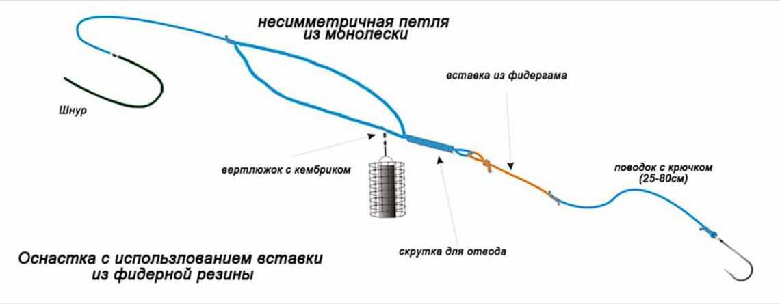 Как уже упоминалось, эта оснастка является одной из самых простых. Во многом она сходна с петлей Гарднера. Главными отличиями являются глухая фиксация кормушки и способ крепления поводка.