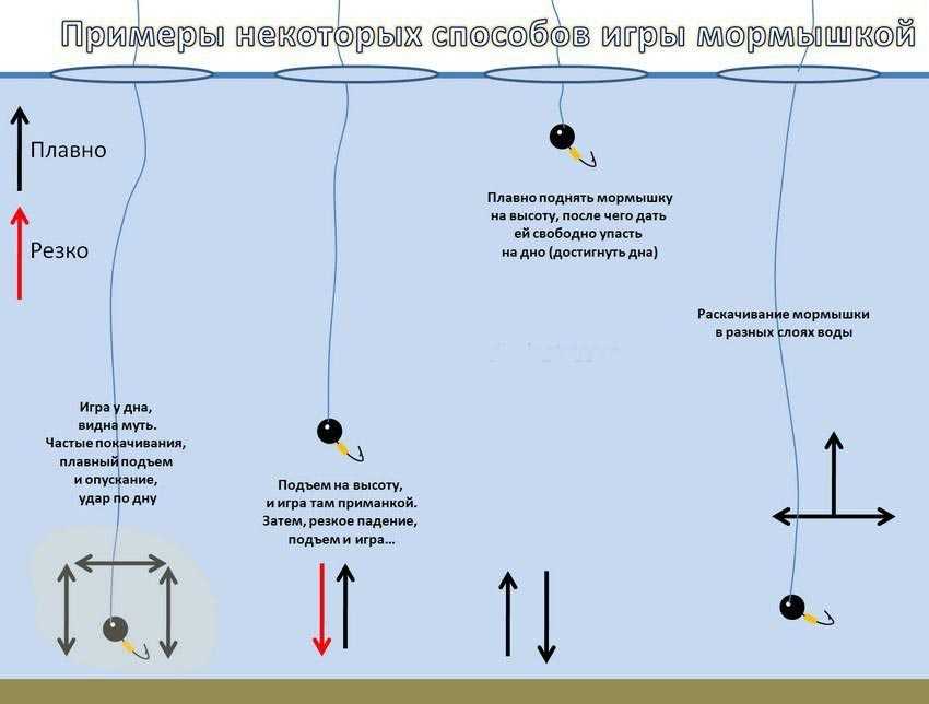 Мормышка опускается до самого дна, после колебаниями кивка нужно ею несколько раз «постучать» по дну. Затем начинается подъем на средней скорости с одновременными короткими колебаниями кивком (примерная амплитуда 1 – 2 см). После того, как приманка поднялась приблизительно на полметра, ее нужно задержать в этом положении на 5 – 7 секунд, далее плавно опускать на дно, продолжая играть кивком. Повторяется эта игра несколько раз, с переменой амплитуды и частоты колебаний. Поклевка может случится и во время подъема, и при опускании. Что примечательно, при погружении мормышки поклевки могут быть довольно странными: прогнутый кивок неожиданно выпрямляется, словно мормышка прикоснулась ко дну. На самом деле – это произошла поклевка. Подсекать нужно моментально.