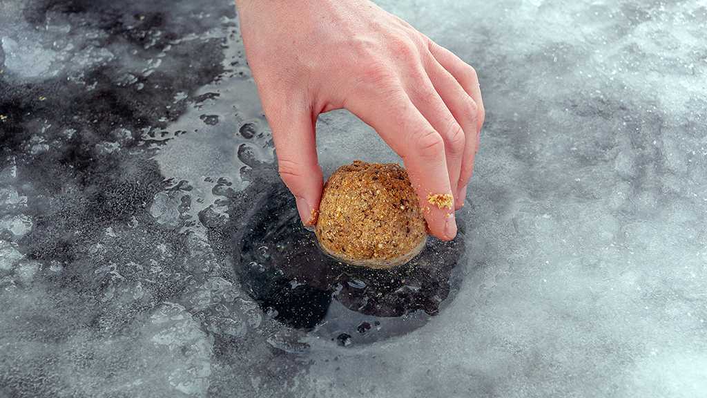 Первое прикармливание надо проводить за 30 мин до начала рыбалки, применяя кормушку большого размера. Когда нет уверенности в том, что лещ обнаружен, надо несильно подкормить как можно больше лунок, если уверенность есть — подкормить пару лунок, но обильно.