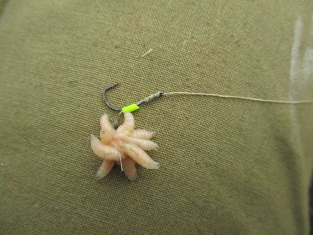 На волосяную оснастку можно насадить несколько личинок или выбрать одну крупную. Рекомендуется такой метод для ловли карпов и других крупных рыб.