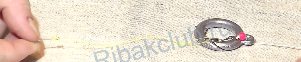 На конце основной лески вяжем петлю или привязываем вертлюжок. К петле или вертлюжку крепим разрезное свинцовое, либо оловянное кольцо, весом 50-70 г на поводке около 40-50 см. Назначение этого кольца – доставить нашу снасть к кормушке по её натянутой леске.Кольцо можно отлить и разрезать, а проще согнуть его из прутка припоя марки ПОС диаметром около 8 мм. Внутренний диаметр кольца должен быть 40-45 мм