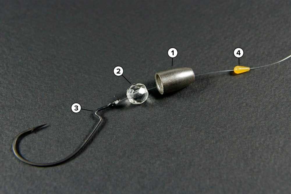 Стандартная оснастка типа Техас (см фото ниже) собирается на леске, по которой должен беспрепятственно перемещаться груз-пуля (1), что заслужил своё название из-за схожести с формой боевой пули. Дополнительно, монтируется офсетный (3), а в некоторых случаях одинарный крючок, и стеклянная бусина (2). Иногда для фиксации длины перемещения груза используют силиконовый стопорок (4).