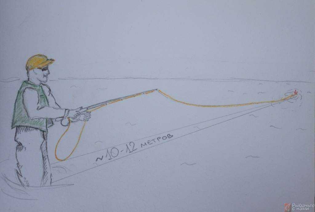 Одновременно с этим, левой рукой подтягивается шнур и ему передается дополнительная энергия. Перед падением, шнур и поводок выпрямляются. Нацеливать бросок необходимо примерно сантиметров на 50, выше требуемой точки.