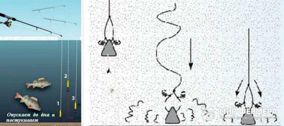 - Приманка опускается на дно водоёма и резко приподнимается на 10 – 20 см. Затем следует повторить процесс заново.