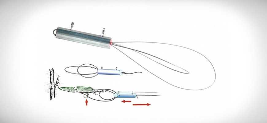 Это комбинированное приспособление. В его основе лежит принцип отвесного отбойника. Отличие заключается в наличии нескольких петель, выполненных из металлического троса, которые выступают в роли захвата приманки. Освобождение воблера осуществляется за счет и силы тяжести отцепа и зацепа за крючки либо его тела.