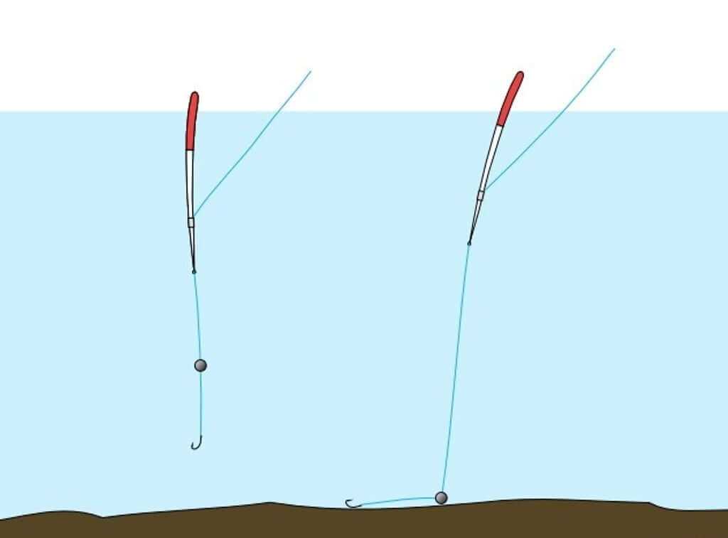 При условии придонной ловли нужно, чтобы на дне водоема была половина поводка с насадкой. Такая хитрость позволит сохранить устойчивость оснастки при повышенном течении либо ветре и привлечет интерес рыбных особей. К тому все элементы огрузки висят не на поверхности, а в толще воды, что не вызовет испуг у рыбы.