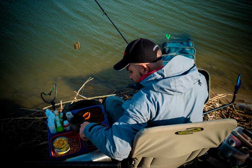 Перед рыбалкой необходимо закормить выбранную точку. В отличие от летней ловли осенние смеси не имеют резких и сладких запахов. Они характерны большим содержанием высококалорийных компонентов. Также следует учесть животную составляющую. Рубленый червь и кормовой мотыль подойдут для этой роли лучше всего. Для ловли на течении смесь необходимо утяжелить, для этого рыболовы используют просеянный грунт из кротовины. Помимо утяжеления, он еще и затемняет прикормку, что вследствие не отпугивает сазана.