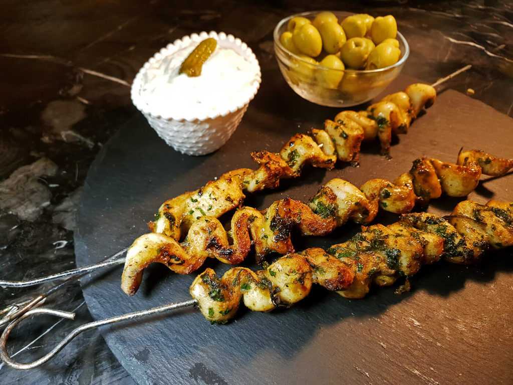 - Обжаривать кальмары на шпажках со всех сторон по 1 минутке. При желании можно повторить процедуру. Подавать шашлык из кальмара и семги на салате из грилованых овощей.